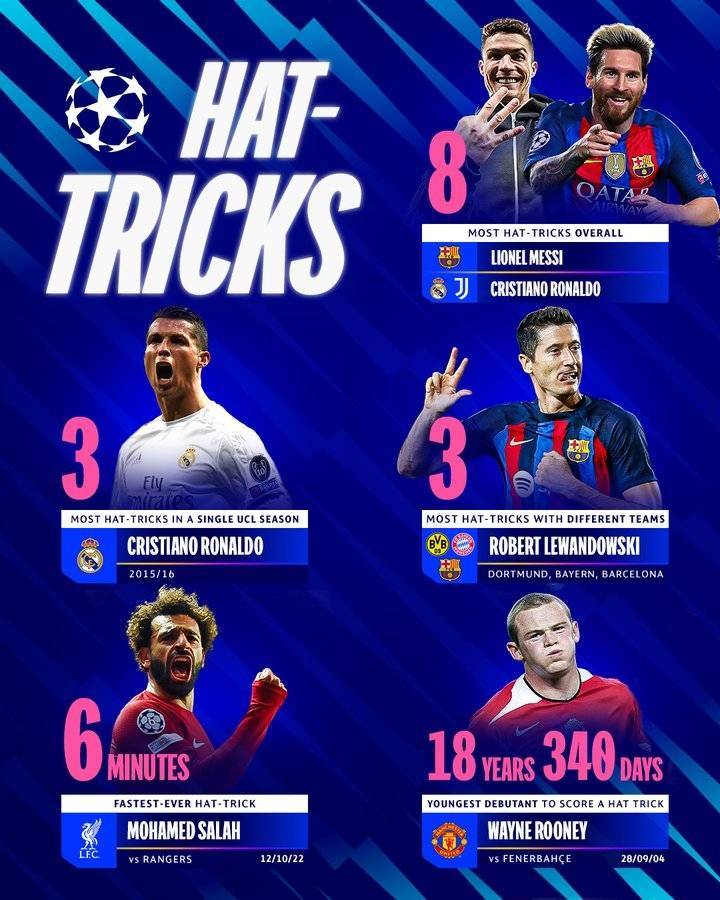欧冠戴帽各项纪录:梅罗8次并列最多、莱万、萨拉赫、鲁尼上榜 admin 2025-07-12 05:30:03 欧冠 直播吧07月11日讯 欧冠官方发布了欧冠历史上上演帽子戏法的各项纪录。最多次戴帽球员:8次-梅西(巴萨)、C罗(皇马、尤文)单赛季欧冠戴帽次数最多球员:3次-C罗(皇马-2015/2016)代表最多俱乐部戴帽球员:3支-莱万(多特、拜仁、巴萨)最快戴帽球员:6分钟-萨拉赫(2022年-利物浦vs流浪者)最年轻戴帽球员:18岁340天-鲁尼(2004年-曼联vs费内巴切) #费内巴切#C罗#利物浦#曼联#欧冠#萨拉赫#鲁尼#球员#梅罗#莱万#巴萨 0 78 # 上一篇:官宣!欧冠四大奖项公开,巴黎与巴萨大赢家,三大未来之星闪耀 # 下一篇:等不及了!巴萨或无法在联赛首轮回归诺坎普 西媒痛批拉波尔塔 相关文章 1-1!马德里竞技与西蒙尼已触及天花板?是时候分道扬镳了吗? 西甲第3轮战报:阿拉维斯1-1马德里竞技,西蒙尼急需一座冠军奖杯!马德里竞技的拥趸心中,迭戈·西蒙尼早已是足球界的传奇人物,这一点毋庸置疑。他球... 宝妮公推/临场9中8!劳师远征不轻松,凯尔特人继续走冷门 content="https://q6.itc.cn/q_70/images03/20250826/d3f88cfa523347548e252855aa1156a5.jpeg"/˃... 7000万欧!唐纳鲁马或被巴黎弃用,曼城尤文抢人,尤文传奇发声 26岁的唐纳鲁马,是从米兰青训出来的天才门将,最近成了足球圈讨论的热点。他刚度过职业生涯最辉煌的一个赛季,帮巴黎圣日耳曼拿到了欧冠冠军,还创造了... 金球奖官方宣布,揭晓30人候选名单!梅西与C罗未入选,前三名大致敲定 金球奖大名单出炉!梅罗时代彻底终结,巴黎9人霸榜刷新历史!2025年金球奖30人候选名单正式公布。梅西和C罗首次同时缺席,17年来第一次没有“绝... 世俱杯:皇马球迷执法,欧冠夺冠非常多、欧战大满贯会师决赛? **世俱杯:巴黎对阵皇马(周三004)****基本面分析**在红牌停赛规则的实施上,各支球队的待遇差异显得尤为微妙。某些争议判罚常常恰好发生在关...